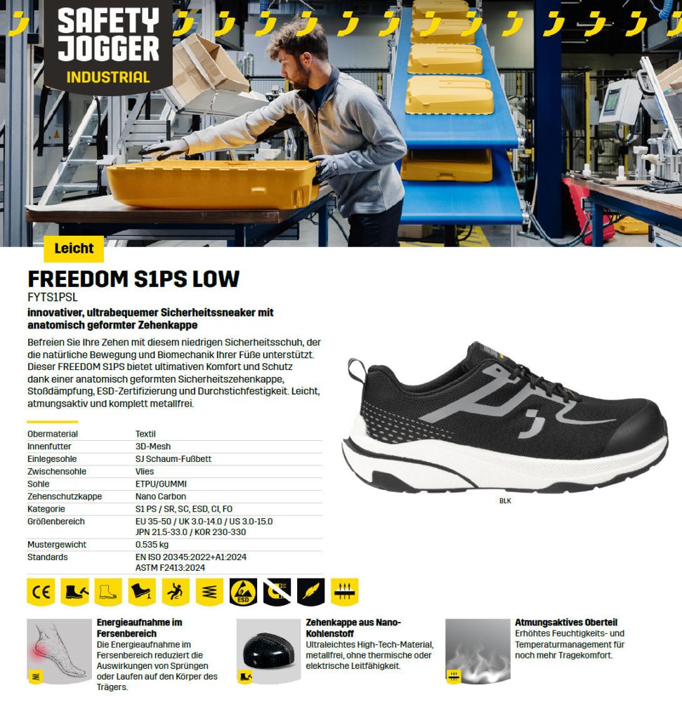 Befreien Sie Ihre Zehen mit diesem niedrigen Sicherheitsschuh, der die natürliche Bewegung und Biomechanik Ihrer Füße unterstützt. Dieser FREEDOM S1PS bietet ultimativen Komfort und Schutz dank einer anatomisch geformten Sicherheitszehenkappe, Stoßdämpfung, ESD-Zertifizierung und Durchstichfestigkeit. Leicht, atmungsaktiv und komplett metallfrei.